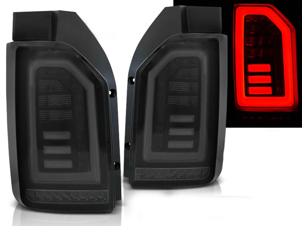 Transporter T6. Model Bagklap '2016-2020. Baglygter. Dynamiske blinklys & LED-BAR. Mørk / Sort / Hvid